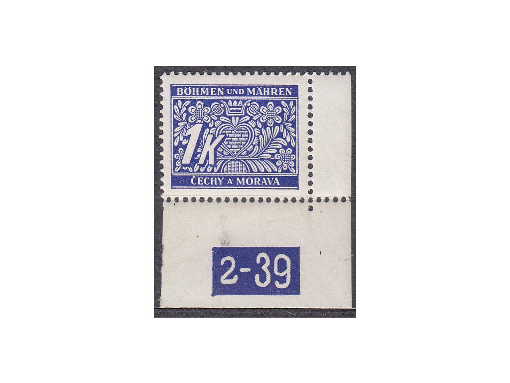 Doplatní známka 1K modrá, pravý roh. kus s DČ 2-39, varianta X, Nr.DL9, **