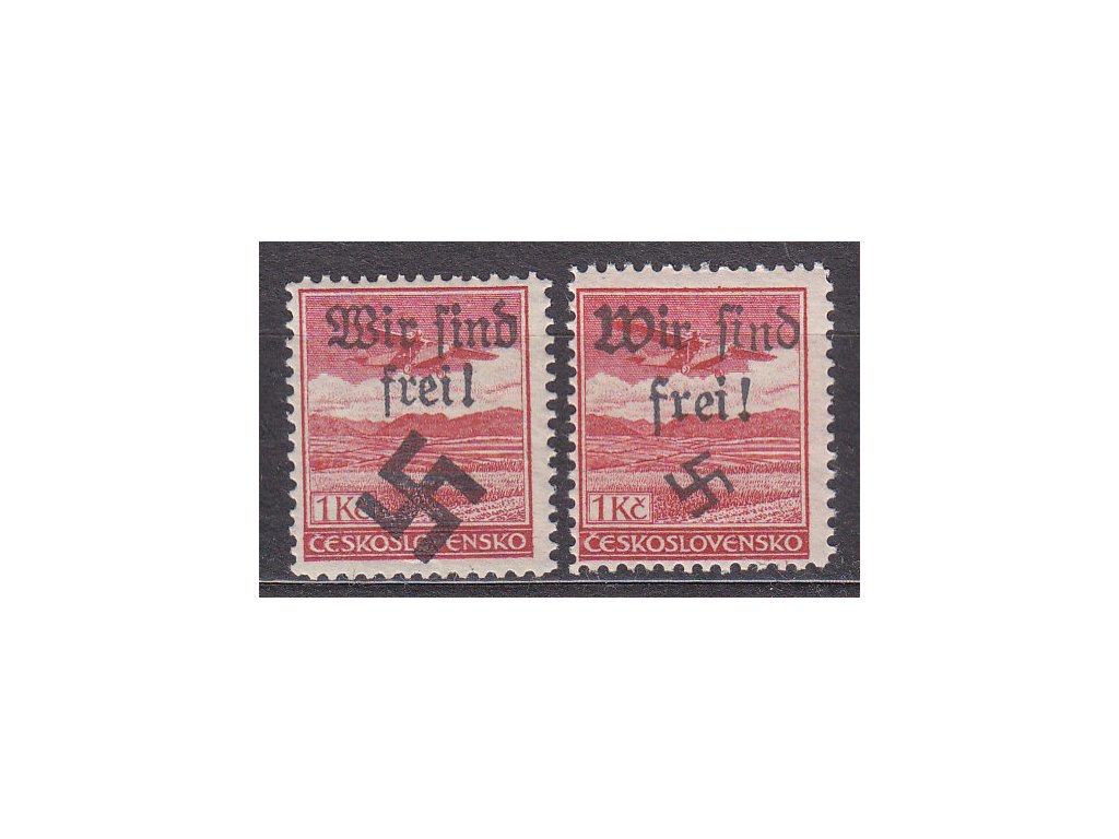 1Kč Letecké, 2 ks, přetisk WIR SIND FREI, různě velká svastika, **