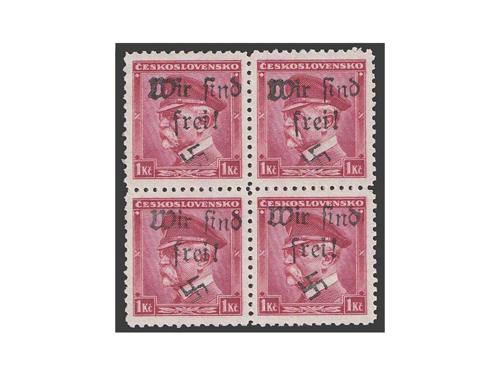 Poštovní známka, Sudety, 1Kč Masaryk, 4blok, přetisk Wir sind frei!, **