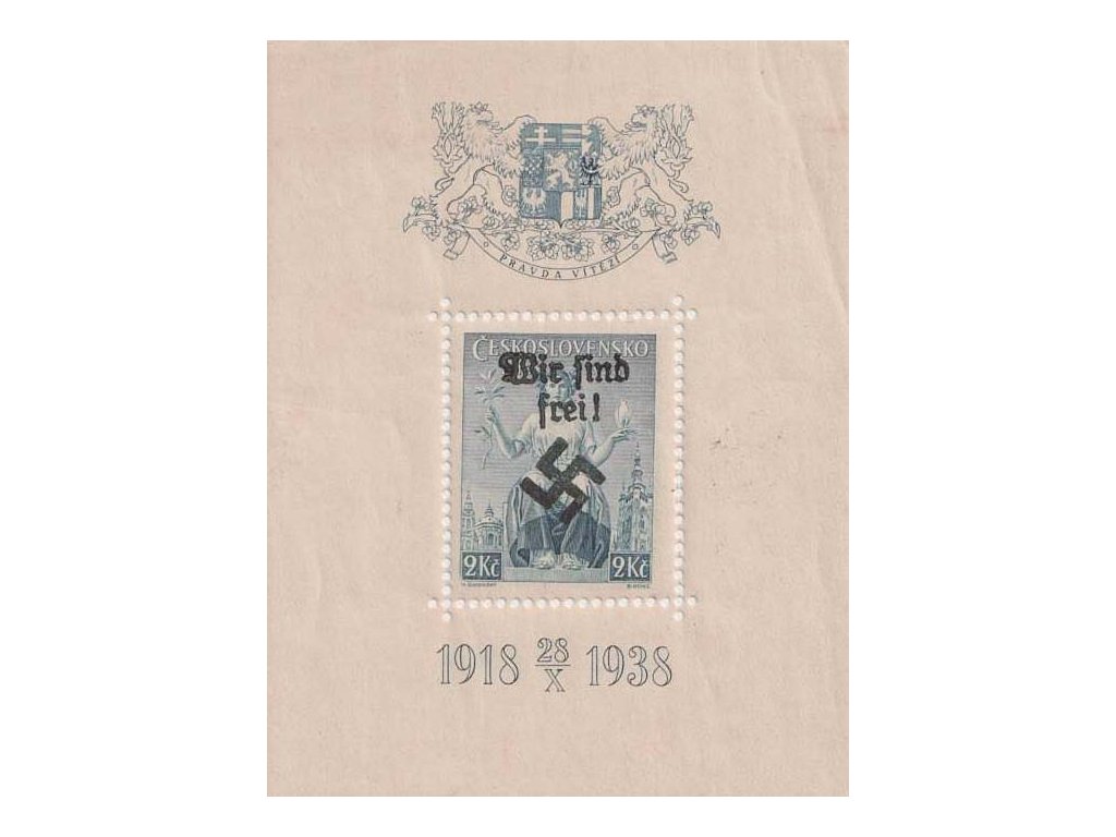 Sudety, 2 Kč aršík Republika, přetisk Wir sind frei!, ** , lom v rohu, drobné archové lomy