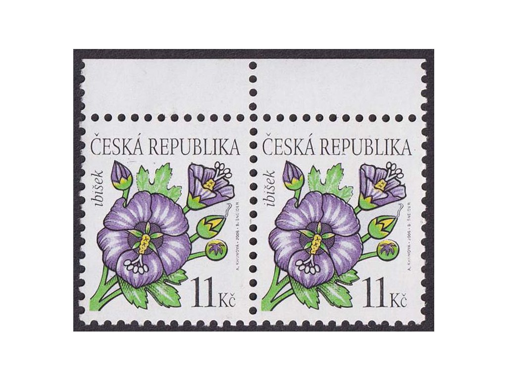 Poštovní známka, 2006, 11 Kč Ibišek, DV - fialová čárka pod "KÁ" (ČESKÁ), Nr.458, ** , ZP 6/1