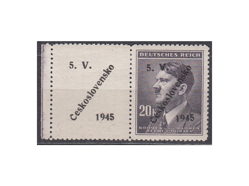 Poštovní známka 20K Hitler, známka s kuponem a přetiskem 5.V.ČESKOSLOVENSKO 1945, * po nálepce