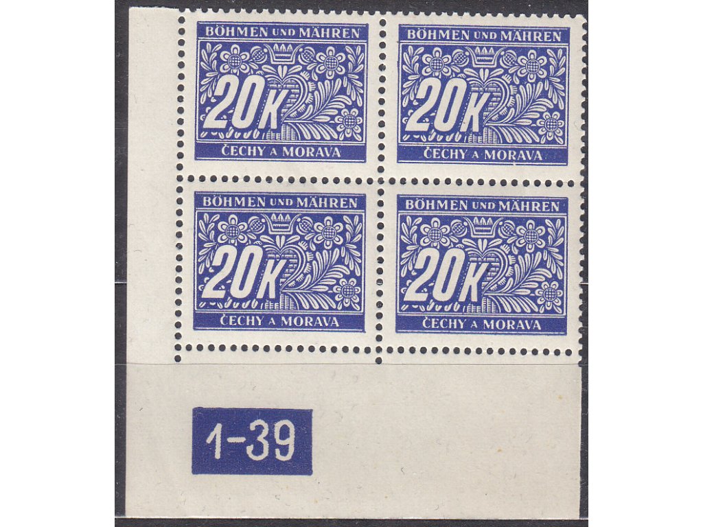 Doplatní známka 20K modrá, levý roh. 4blok s DČ1-39, varianta Y, Nr.DL14, **