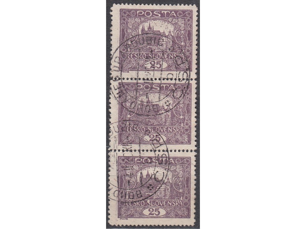 Známka Hradčany 25h fialová, Řz.11 1/2:10 3/4, 3páska, prostřední zn. příčkový podtyp, Nr.11E, razítkované