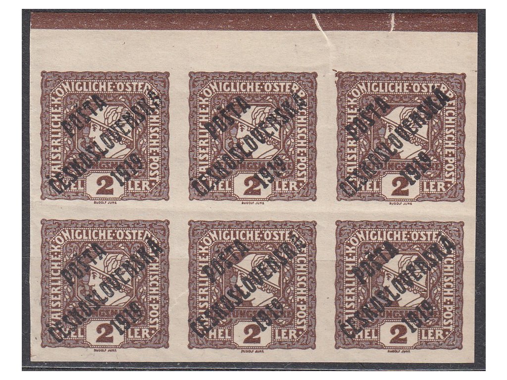 2h novinová, krajový 6blok - 2 vrypy v okraji, známka platná v ČSR, **, přeloženo mezi zn.