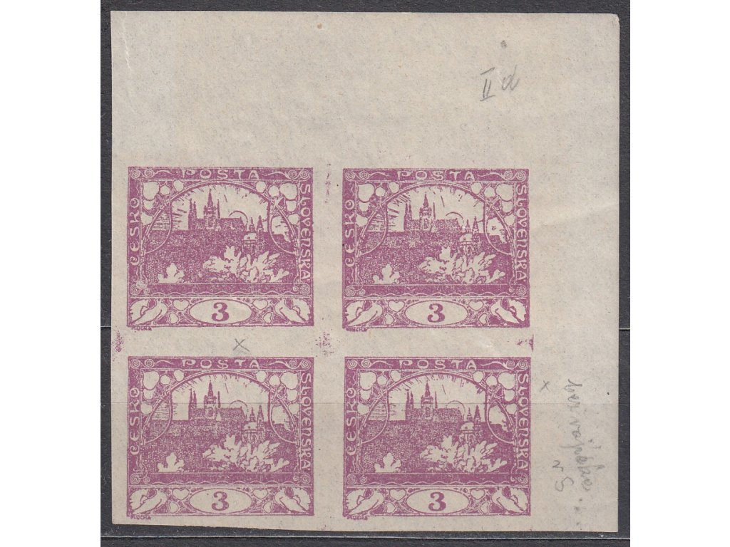 Známka Hradčany 3h fialová, pravý horní roh. 4blok, Nr.2, **