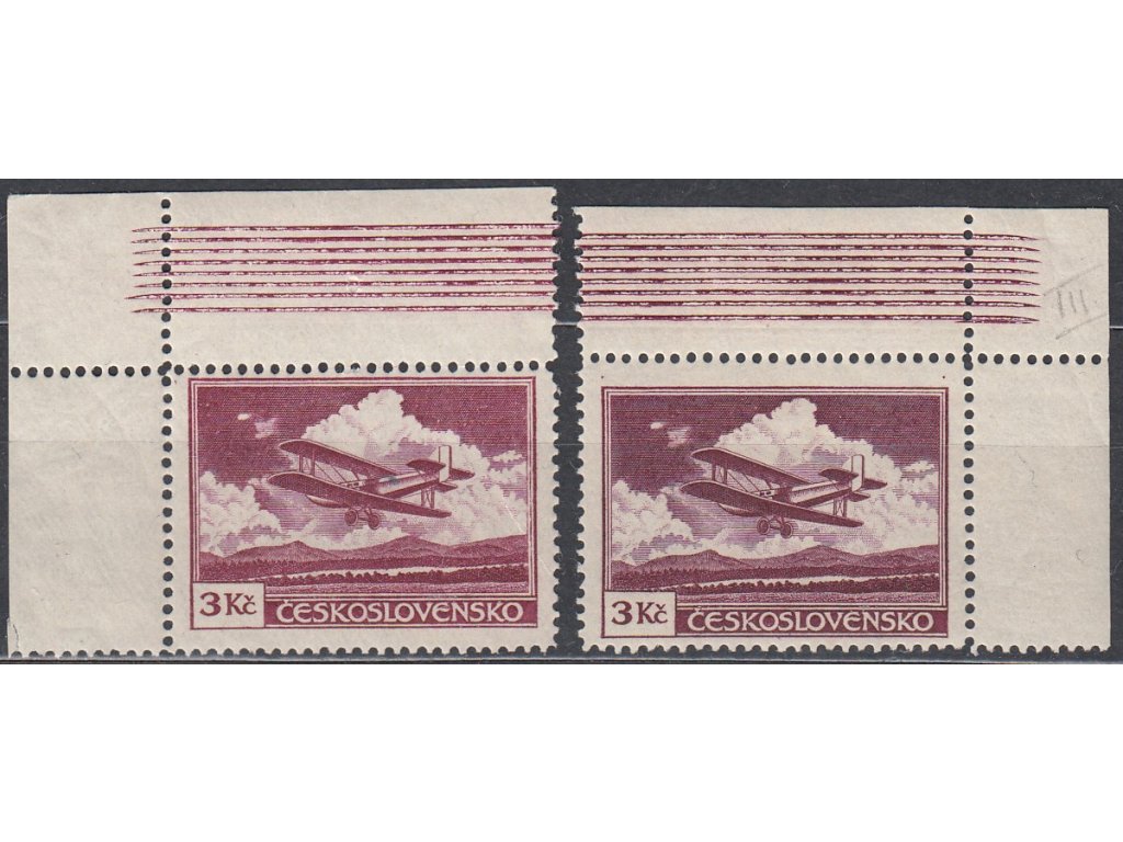 Letecká známka 3Kč fialová, III.typ, L+P horní roh. kusy s bordurou na okraji, Nr.L10, **