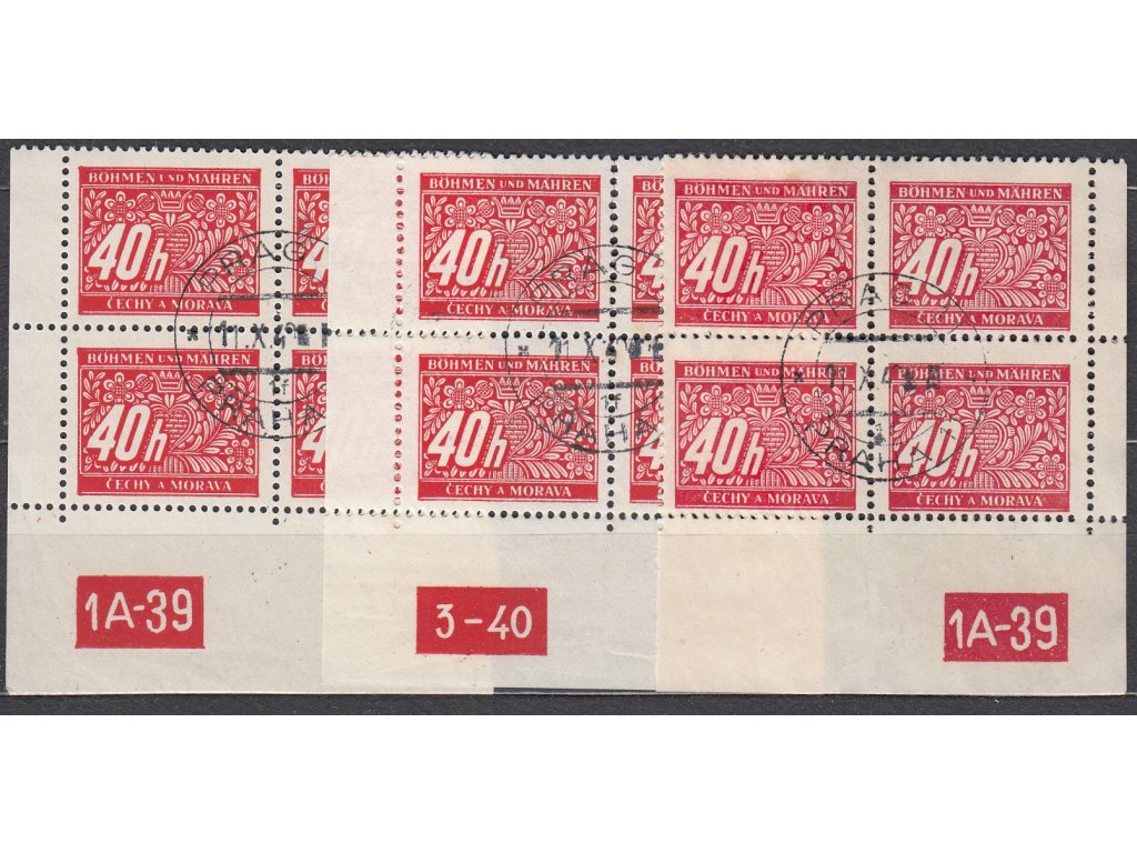 Doplatní známka 40h červená, 3 roh. 4bloky s DČ, různá DČ a varianty okrajů, Nr.DL5, razítkované