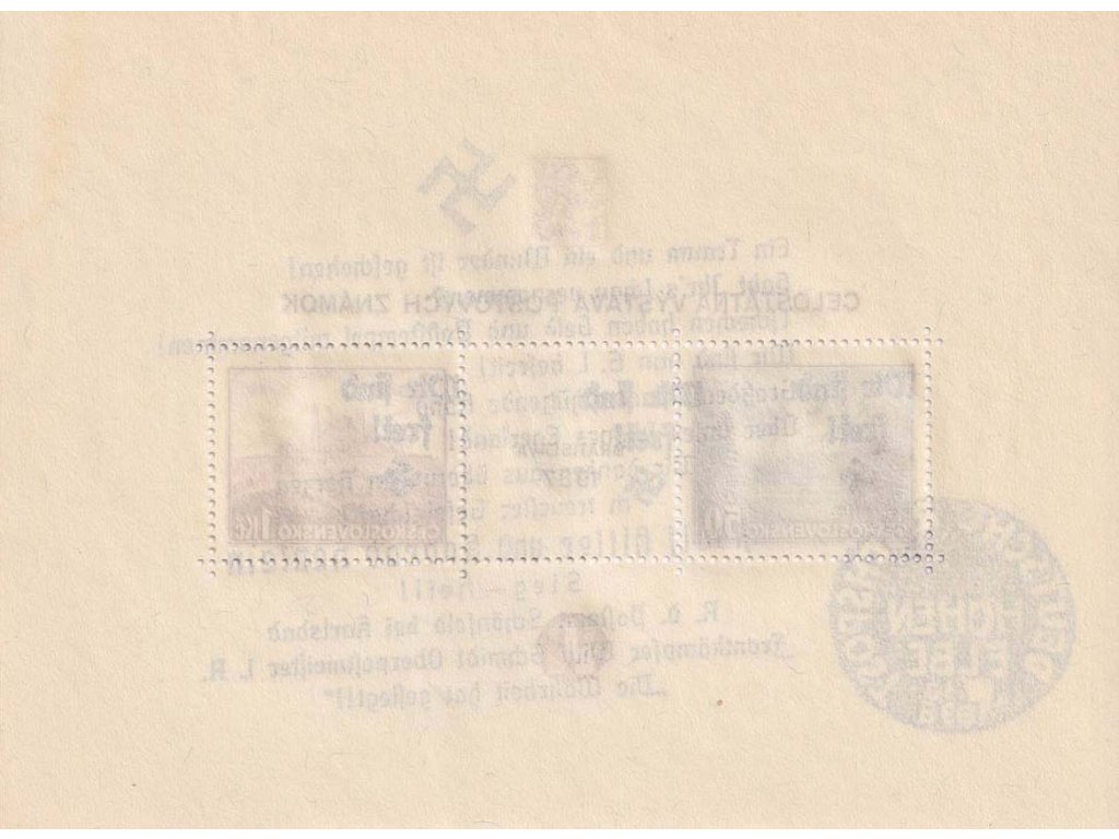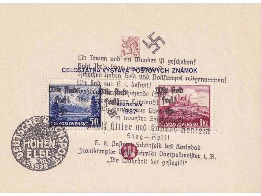 Sudety, 50h-1Kč aršík Bratislava, přetisk Wir sind frei!, razítka, kvalita - viz. foto