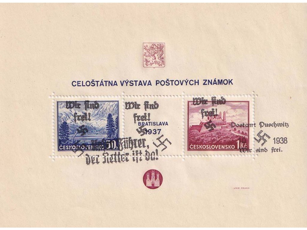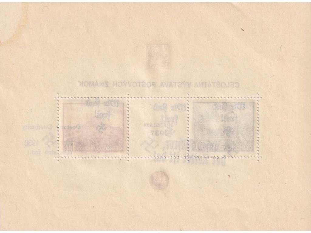 Sudety, 50h-1Kč aršík Bratislava, přetisk Wir sind frei!, razítka, kvalita - viz. foto