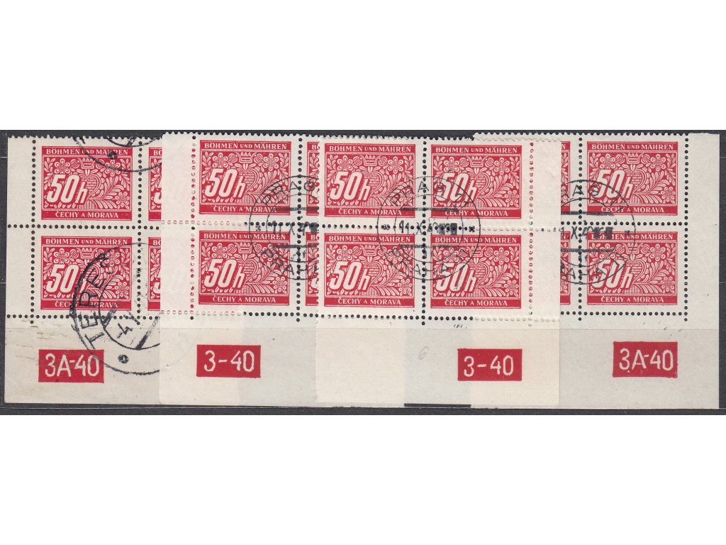 Doplatní známka 50h červená, 4 roh. 4bloky s DČ, různá DČ a varianty okrajů, Nr.DL6, razítkované