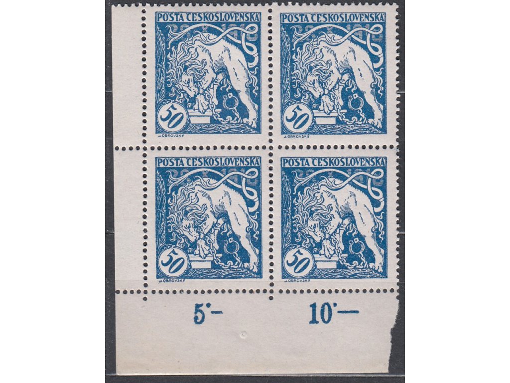Poštovní známka 50h modrá, kraj. 4blok s DZ - krátká pomlčka po "5", Nr.29A, **