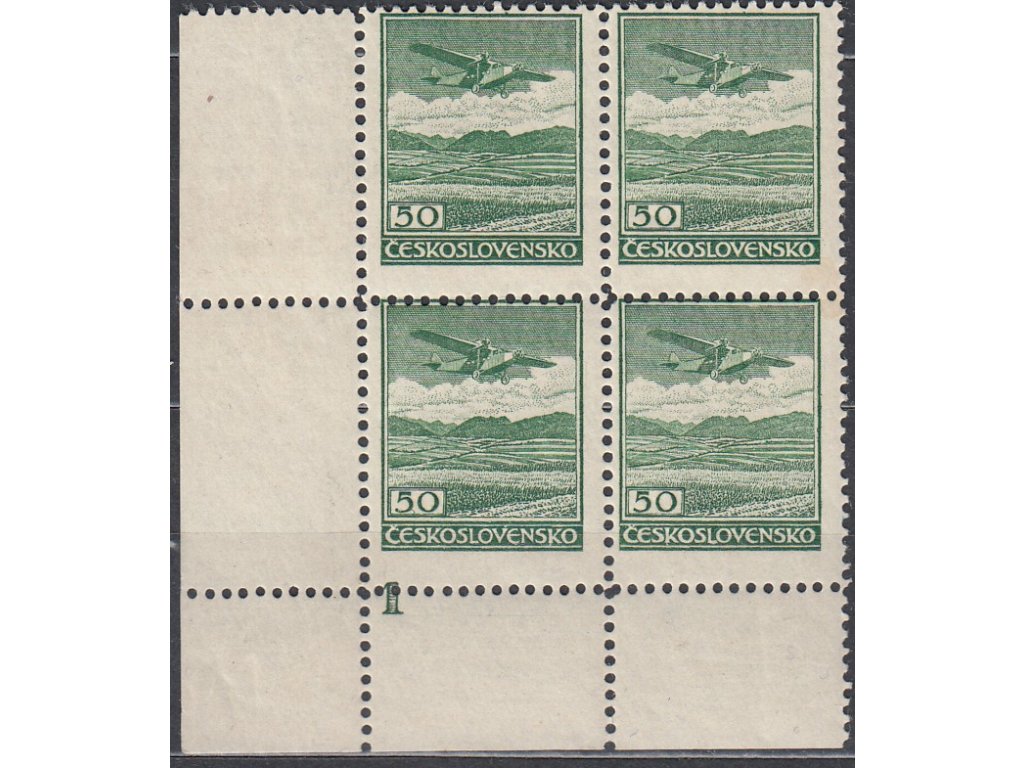 Letecká známka 50h zelená, úzký formát, rohový 4blok s DČ 1, Nr.L7, **, ilustrační foto