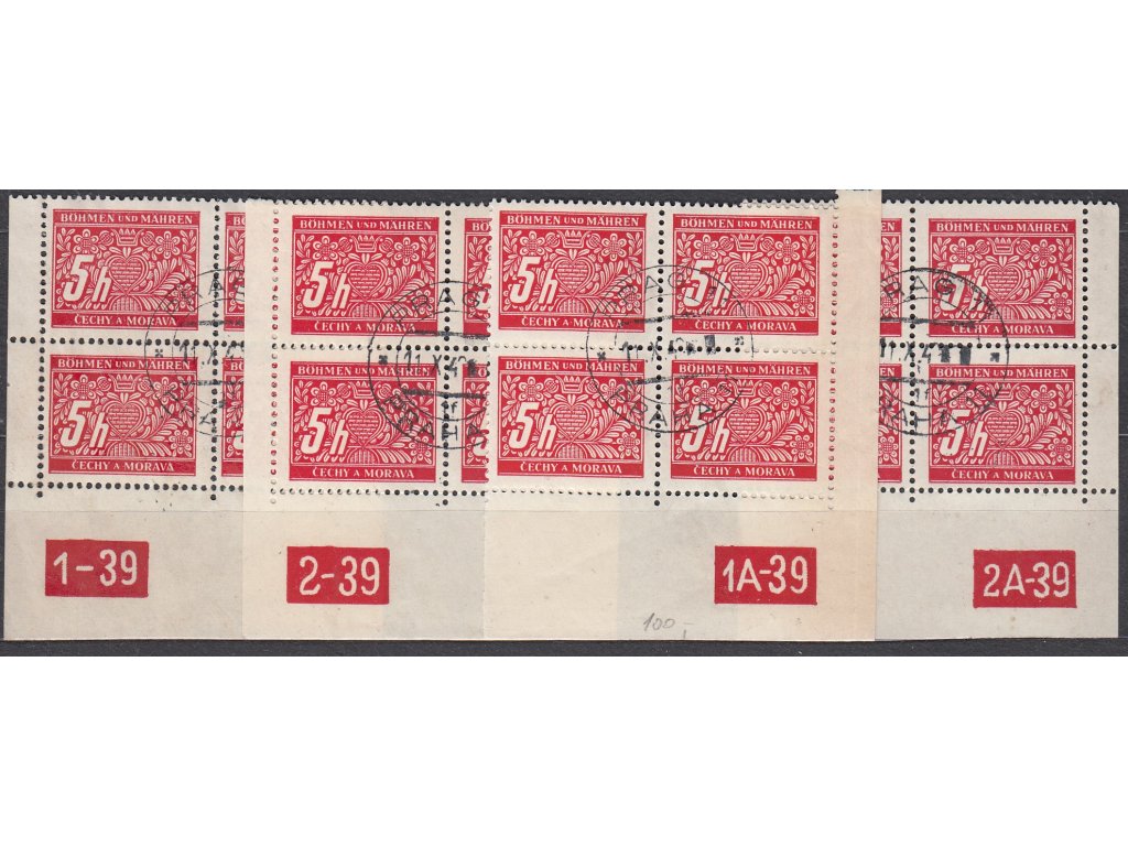 Doplatní známka 5h červená, 4 roh. 4bloků, různá DČ a varianty, Nr.DL1, razítkované