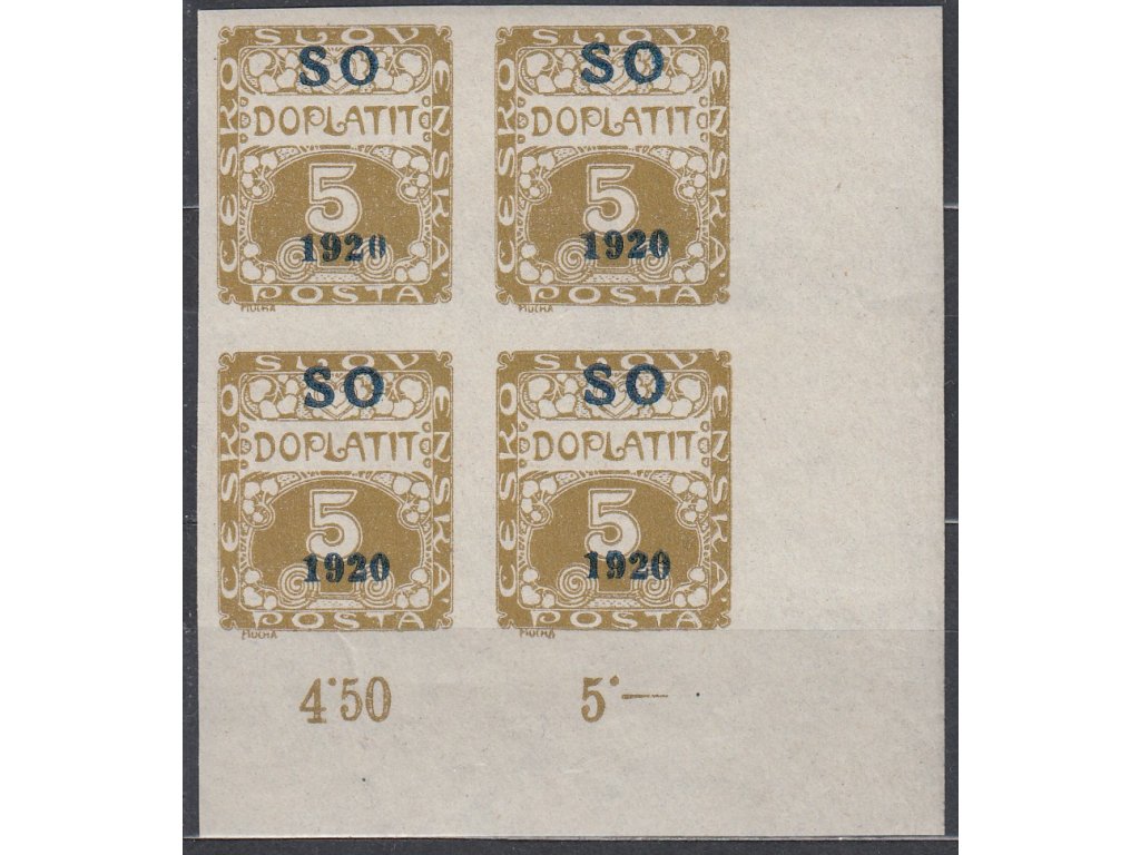 Doplatní známka 5h hnědoolivová, rohový 4blok s počitadly, tenký papír, Nr.SO33, **