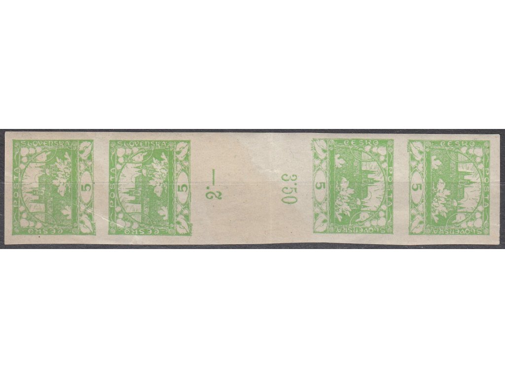 Známka Hradčany 5h světle zelená, 4známkové meziarší, lehce přeložené, Nr.3M, * po nálepce, lom