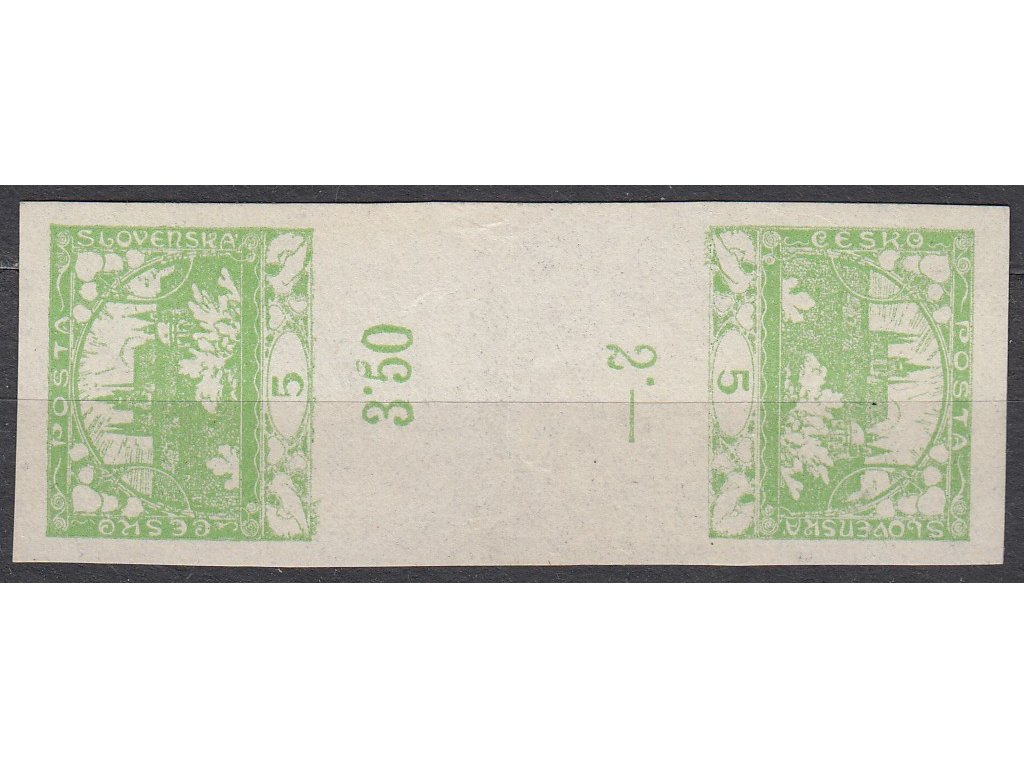 Známka Hradčany 5h světle zelená, meziarší, nepřeložené, zk.Gilbert, Nr.3M, * po nálepce - reparovaný lep!