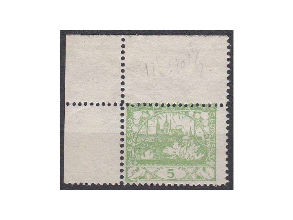 Známka Hradčany 5h tmavě zelená, Řz.11 1/2:10 3/4, rohový kus s posunem vodorovné perforace, Nr.3Ea, **