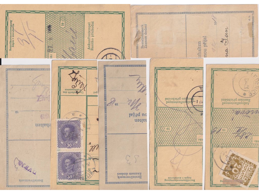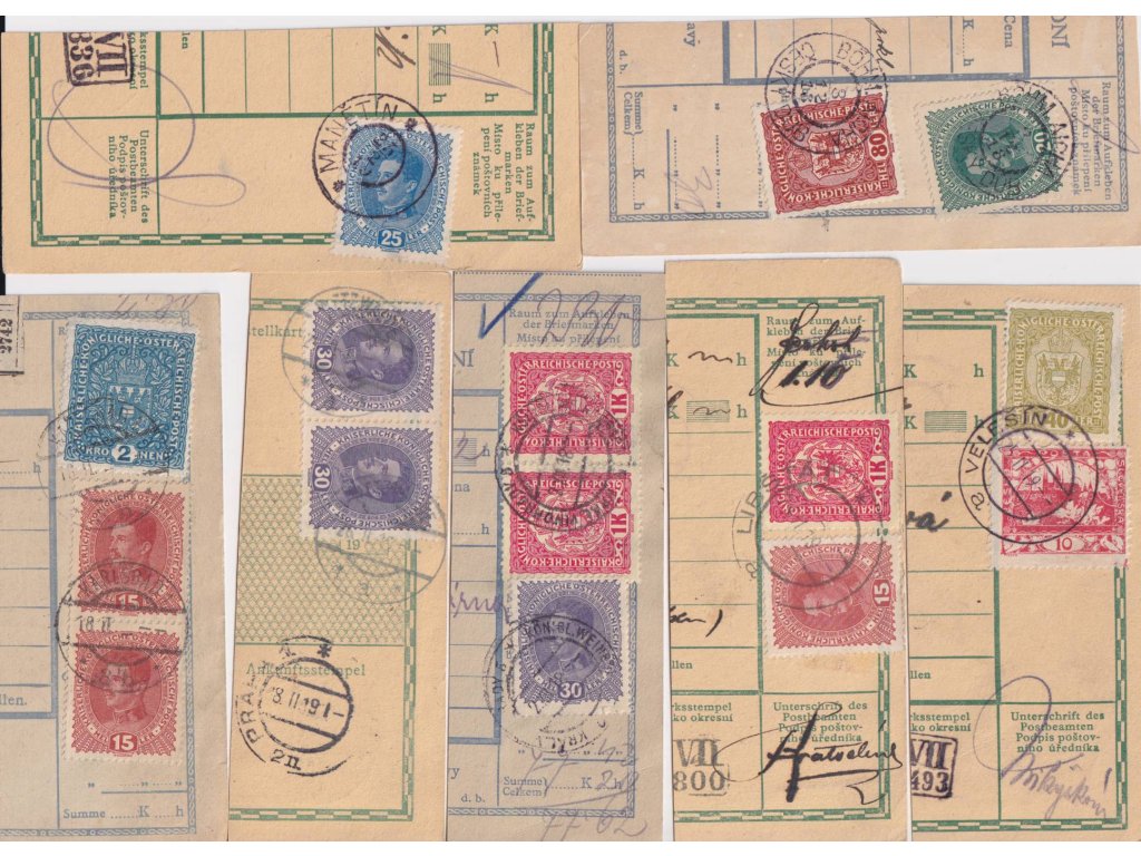 8 ks ústřižků průvodek, rak. a čs. zn. použité po 28.10.1918, hezká sestava