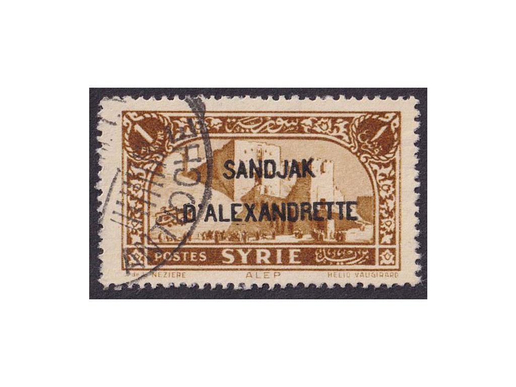 Poštovní známka, Alexandrette, 1938, 1 Pia s přetiskem Sandjak, MiNr.5, razítkované