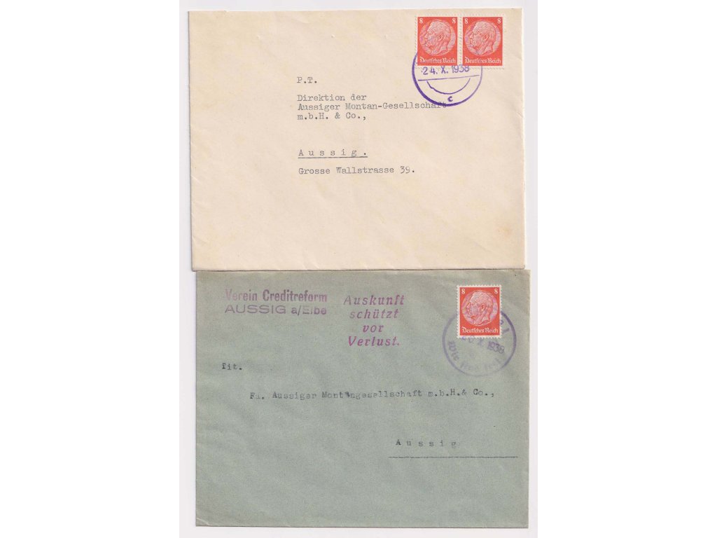 Sudety, Aussig, 1938, 2 ks firemních dopisů, provizorní razítka Aussig, prošlé v letech 1938