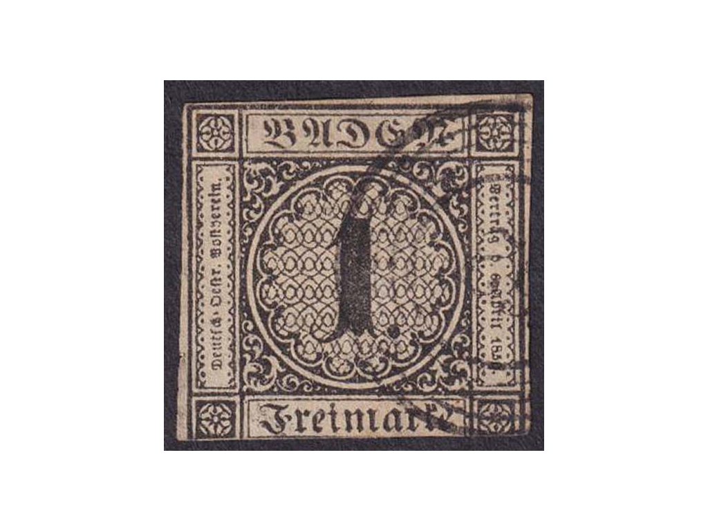 Baden, 1851, 1 Kr černá/sametová, MiNr.1, razítko, lehké stopy stáří