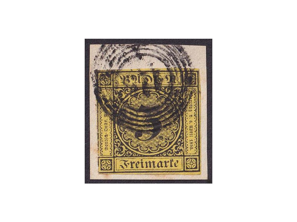 Poštovní známka, Baden, 1851, 3 Kr černá/oranžová, MiNr.2, výstřižek, několik nepatrných skvrnek