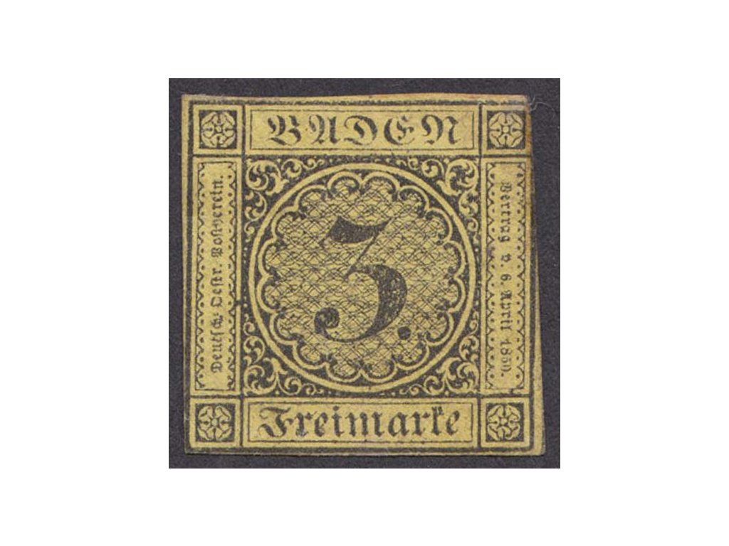 Poštovní známka, Baden, 1851, 3 Kr černá/žlutá, MiNr.2, * po nálepce, lehký lom - viz. foto