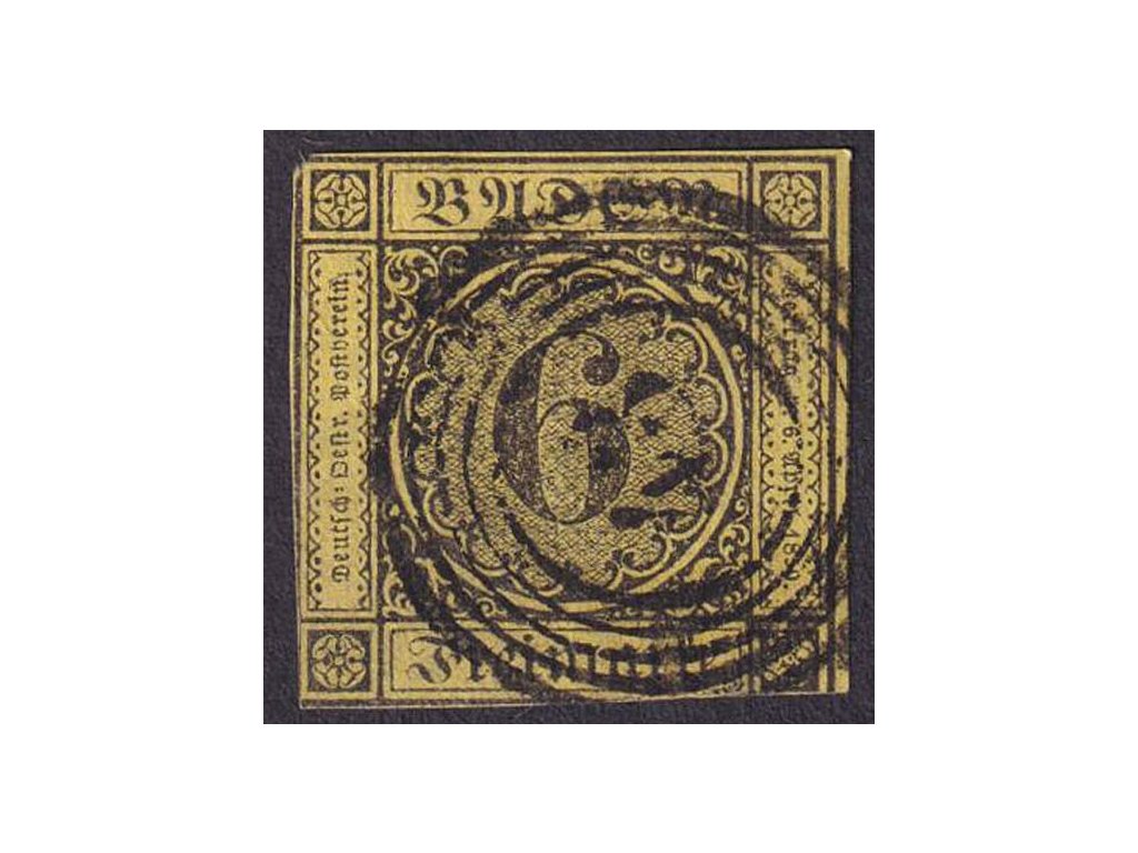 Poštovní známka, Baden, 1853, 6 Kr černá/žlutá, MiNr.7, razítkované