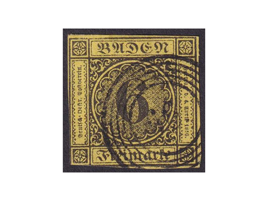 Poštovní známka, Baden, 1853, 6 Kr černá/žlutá, MiNr.7, razítkované