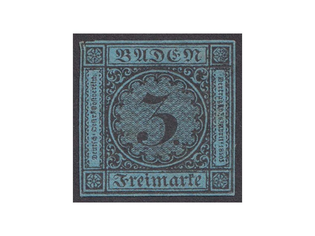 Baden, 1858, 3 Kr černá/modrá, MiNr.8, (*) bez lepu, lehký lom, dv