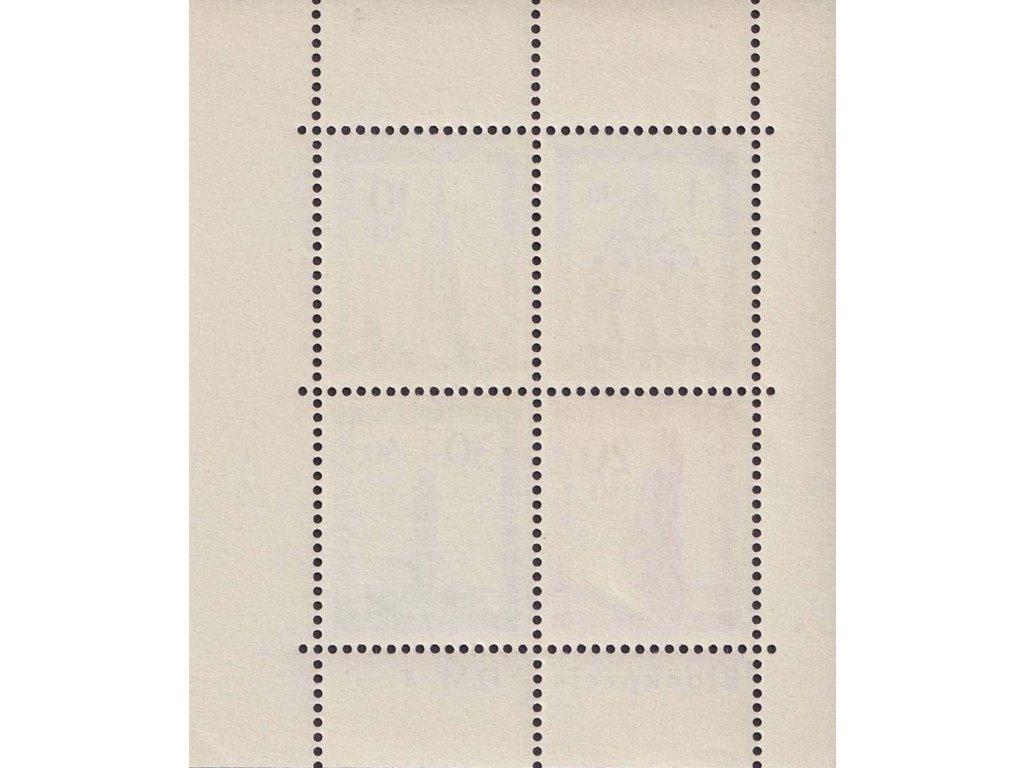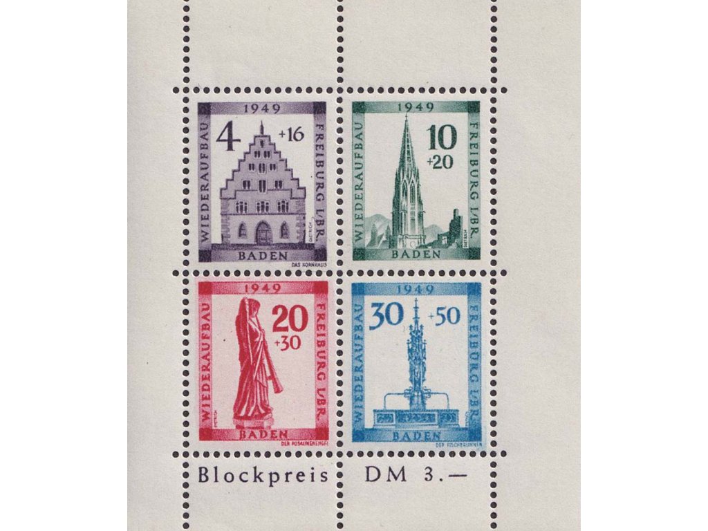Poštovní známka, Baden, 1949, 4-30 Pf aršík Stadt Freiburg, DV - čárka pod "B", MiNr.Bl1A IV, **
