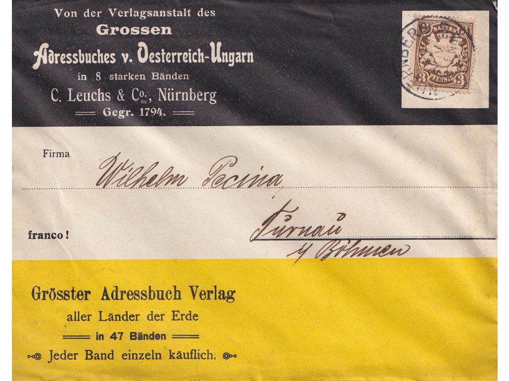 Poštovní celistvost, Bayern, 1905, DR Nüernberg, reklamní obálka vydavatelství C. Leuchs & Co. z Norimberku, zasl. v roce 1905 do Turnova, stopy poštovního provozu, slušný dekorativní kus