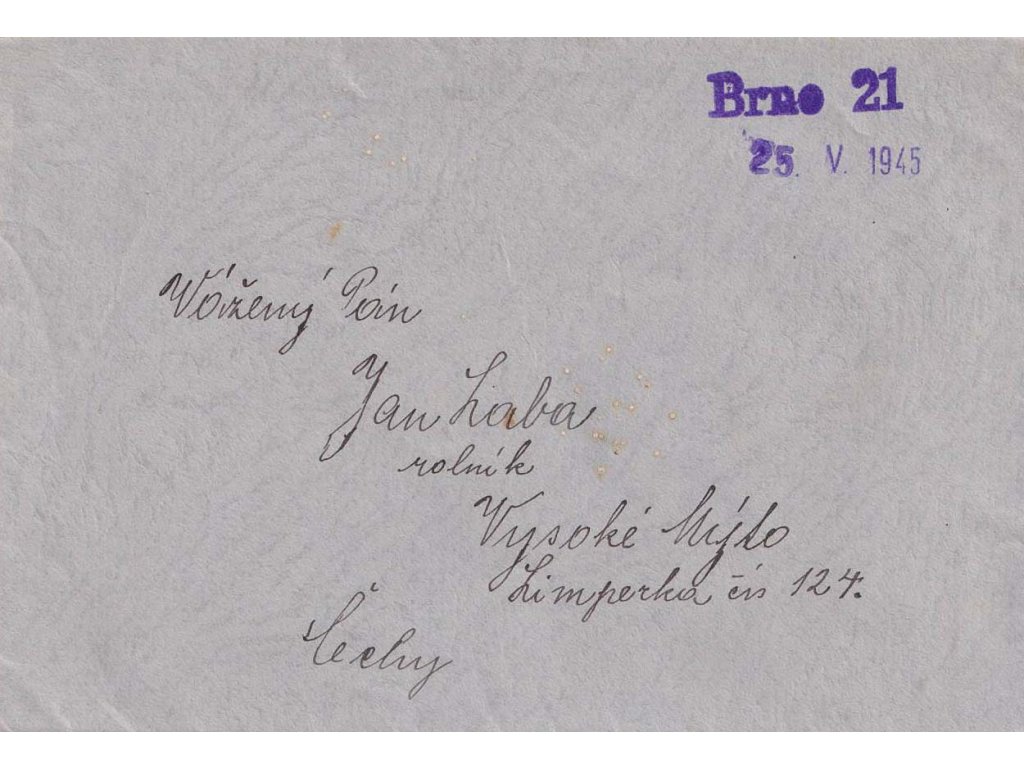 Poštovní celistvost, Brno 21, dopis zasl. v roce 1945 do Vysokého Mýta, stopy poštovního provozu - viz. foto