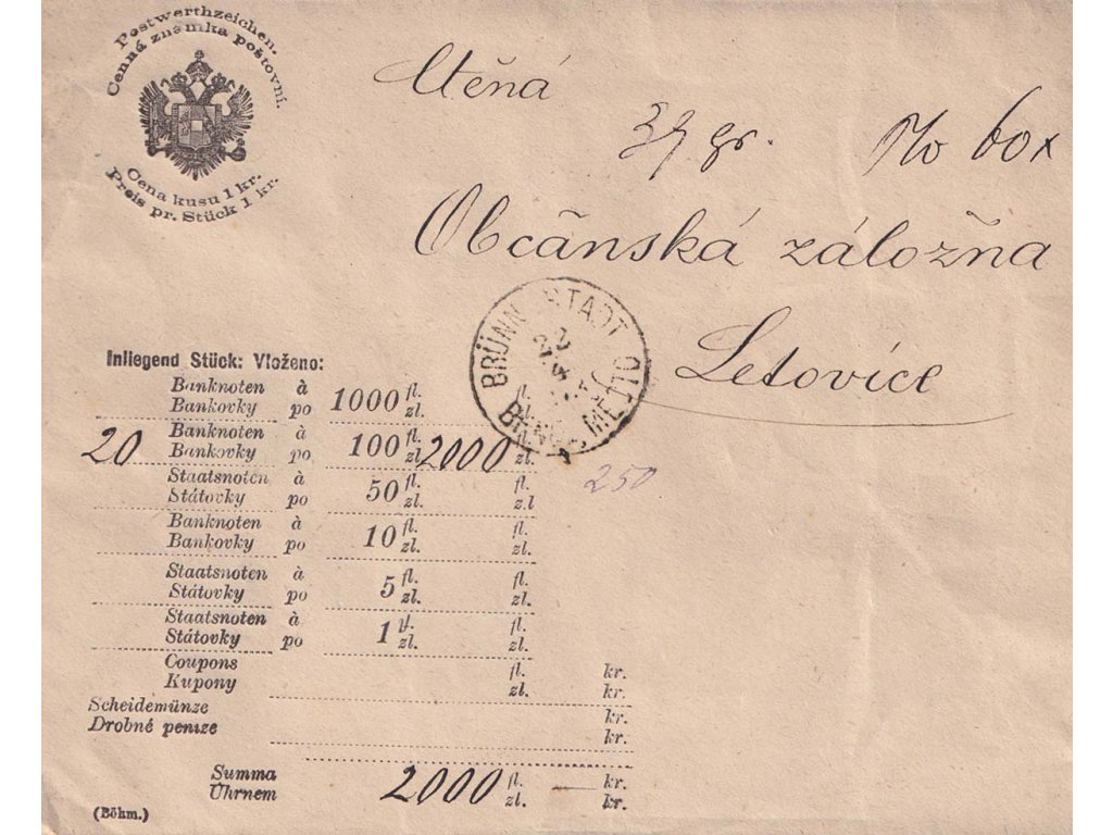 Brno-Město, cenný dopis zaslaný v roce 1893 do Letovic, lehká omačkání,