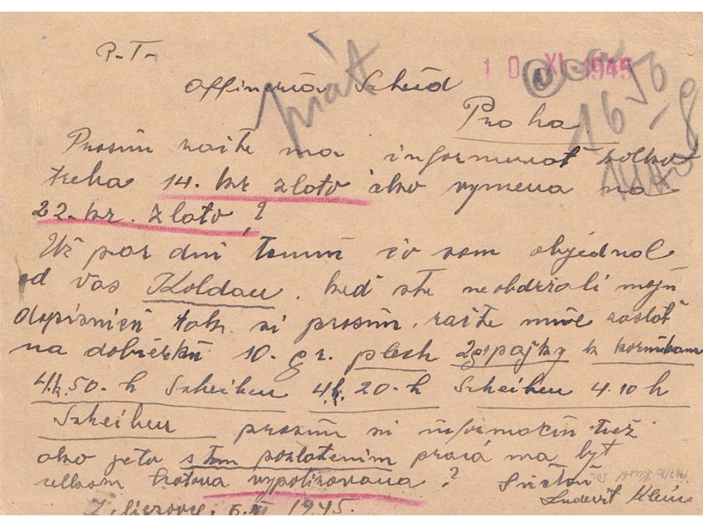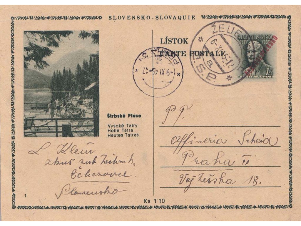 Poštovní dopisnice, CDV 79 (1) Rázus (Štrbské Pleso), DR Želiezovce, zasl. v roce 1945 do Prahy, lehká omačkání a stopy pošt. provozu, jinak slušný kus