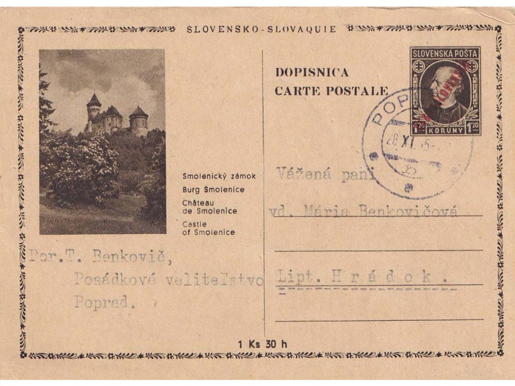 Poštovní dopisnice, CDV 81 (18A) Hlinka (Smolenecký zámok), červený přetisk ČESKOSLOVENSKO, DR Poprad, zasl. v roce 1945 na Slovensku, skutečně prošlé, ohnuté růžky a stopy poštovního provozu - viz. foto