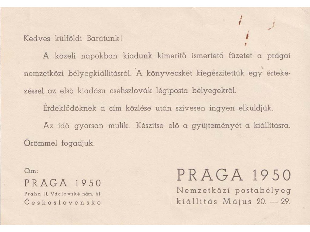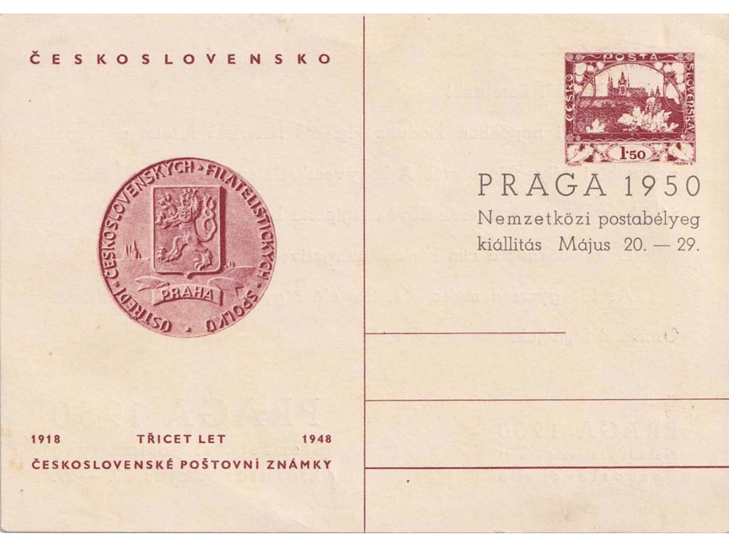 Poštovní dopisnice, CDV 95 (6) A Výročí známky s přítiskem Výstavy známek PRAGA 1950, maďarský text, neprošlé, horší jakost - viz. foto