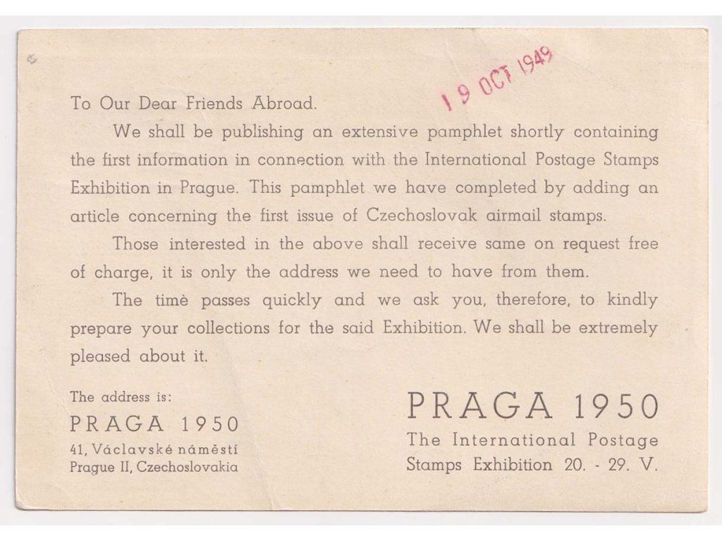 CDV 95 s anglickým textem při výstavě PRAGA 1950, DR Praha, prošlé