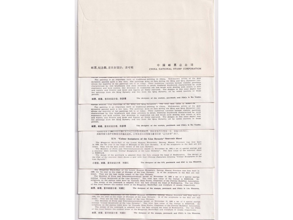 Obálky FDC, Čína, 1980/1982, FDC 1811-1814 Drak, FDC 1810-1815 Vějíře a FDC 1836-1839 Skulptury