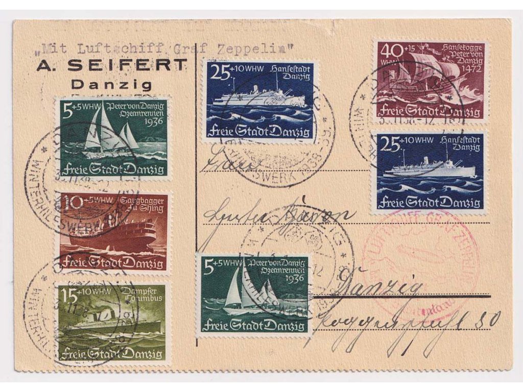 Poštovní celistvost, Danzig, Zeppelin, firemní karta vyfr. pestrou frankaturou známek přepravená Zeppelinem, DR Danzig + zeppelinový kašet, prošlé v roce 1938 v Danziku, mírné stopy stáří