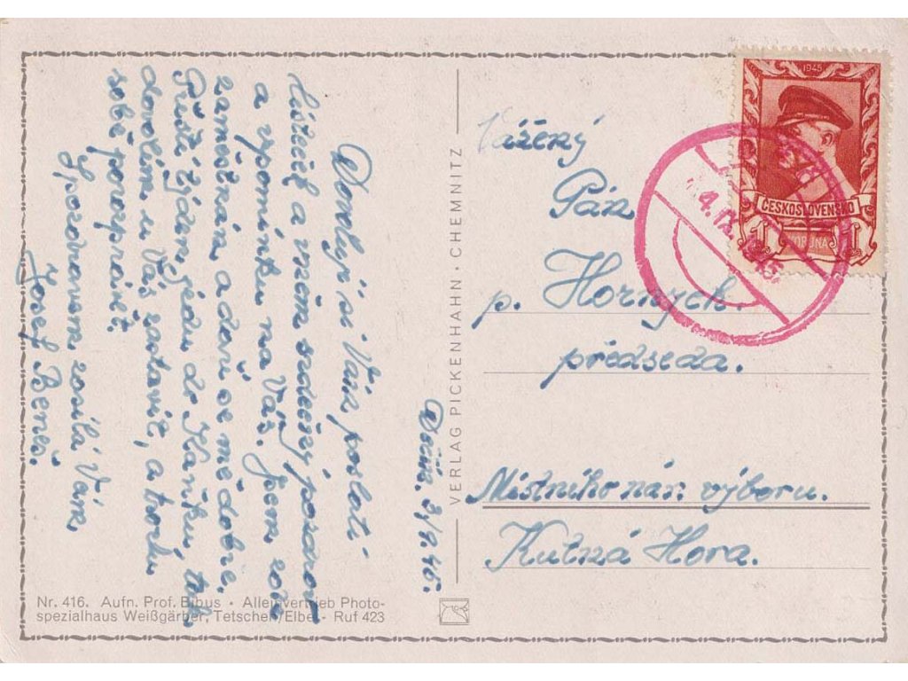 Děčín, pohlednice zasl. v roce 1945 do Kutné Hory, dv