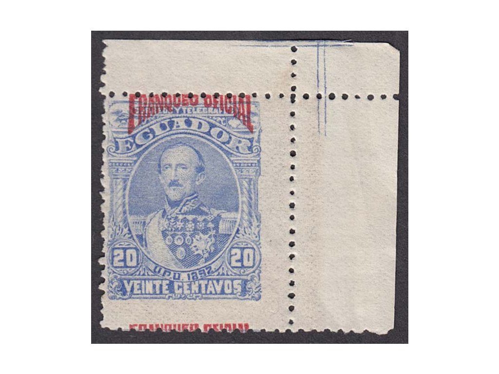 Poštovní známka, Ecuador, 1892, 20 C služební, MiNr.5, * po nálepce, posun a obtisk