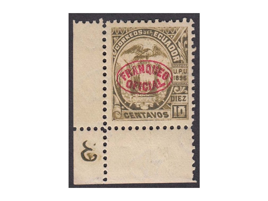 Ecuador, 1896, 10 C služební, roh. kus s DZ, MiNr.25Y, * po nálepce