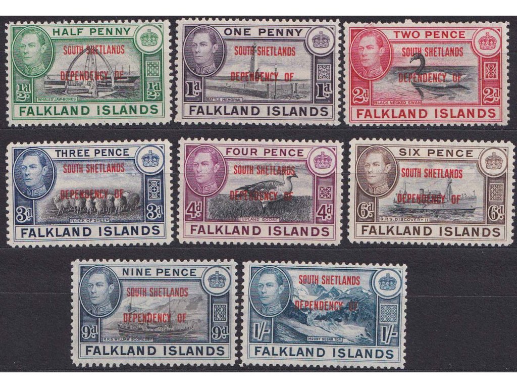 Poštovní známka, Falklandy, South Shetlands, 1944, 1/2P-1Sh série s přetiskem, MiNr.D1-8, * po nálepce