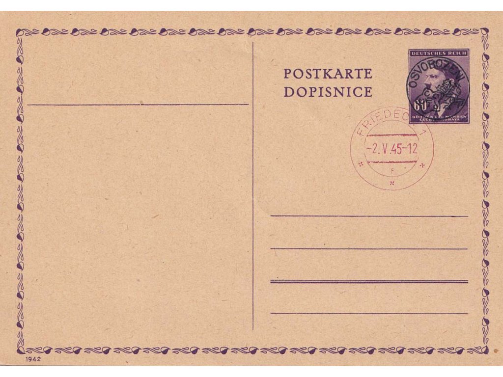 Frýdek, 1945, dopisnice 60 h Hitler s přetiskem Osvobození, červené razítko