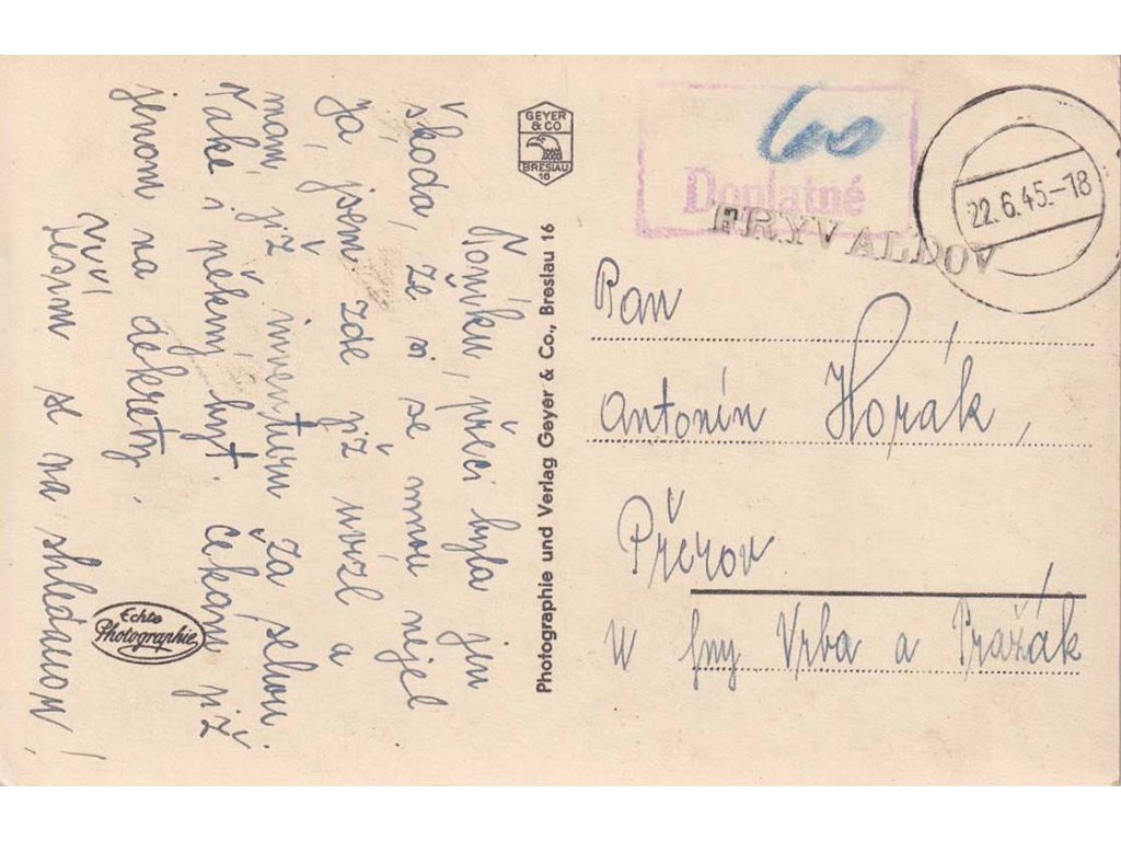 Frývaldov, pohlednice zasl. v roce 1945 do Přerova, doplatné