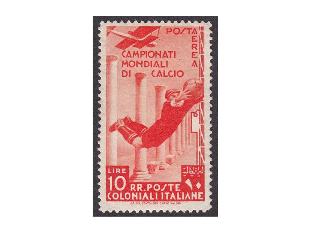 Poštovní známka, Italské kolonie, 1934, 10 L MS ve fotbale, MiNr.84, * po nálepce