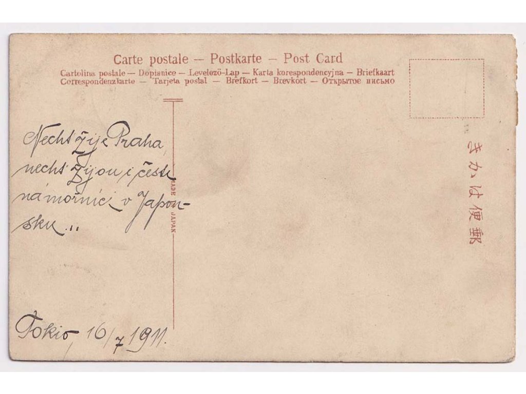 Lodní pošta, Japonsko, 1911, pohlednice Tokia + razítko S.M.S. Kaiser Franz Josef I., neprošlé v roce 1911, suvenýrová pohlednice z návštěvy lodě v Japonsko, japonská známka poškozena, neprošlé, stopy stáří