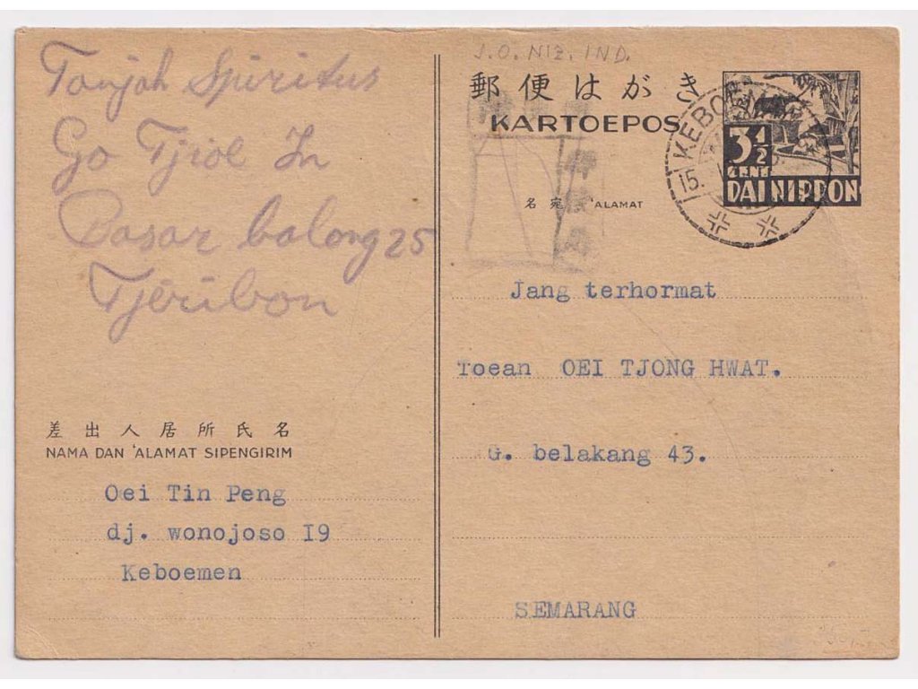 Jáva, 1943, obsazení, dopisnice 3 1/2 C zasl. do Samarandu, stopy provozu